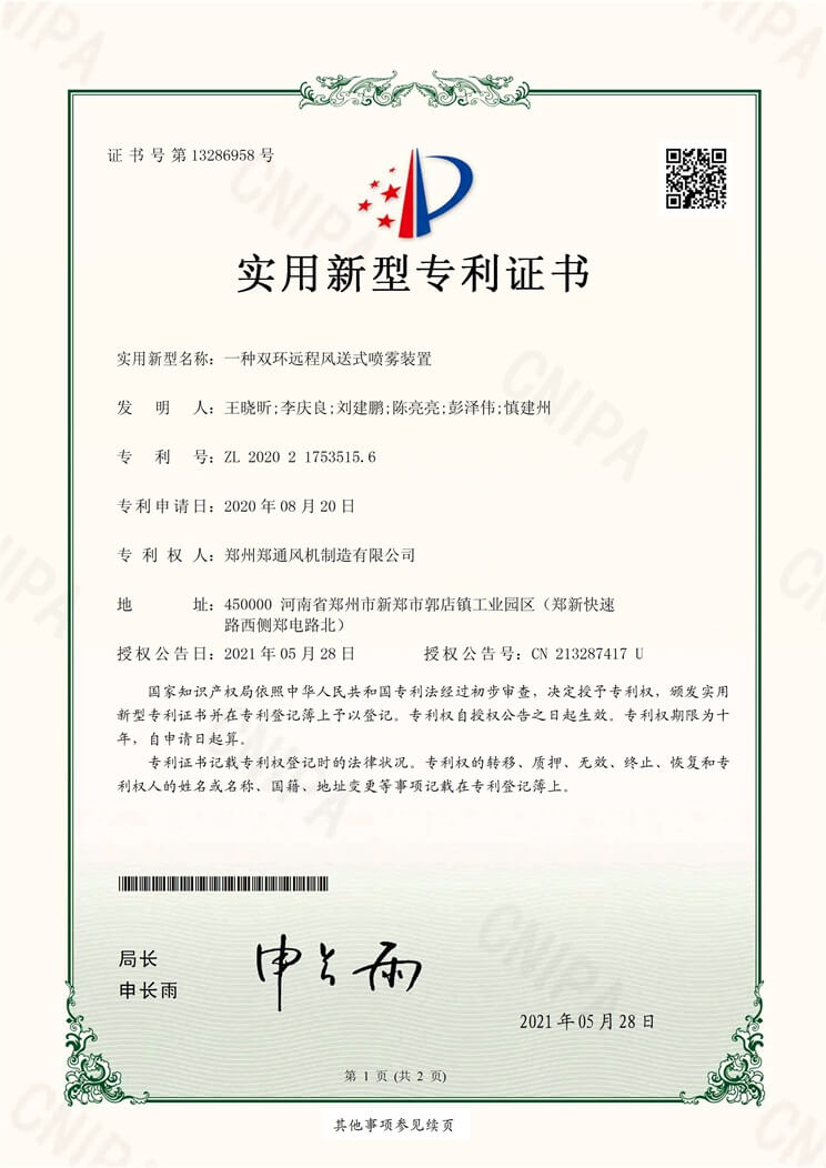 遠(yuǎn)程風(fēng)送式噴霧風(fēng)機(jī)實(shí)用新型專利證書(shū)