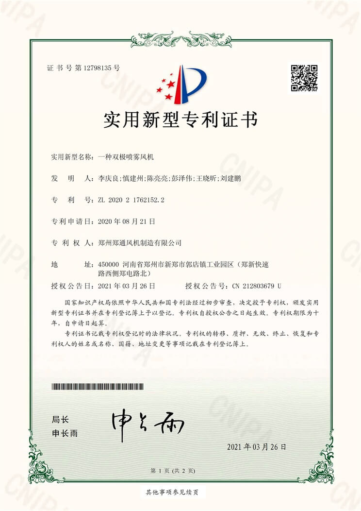 一種雙極噴霧風(fēng)機(jī)實(shí)用新型專利證書(shū)
