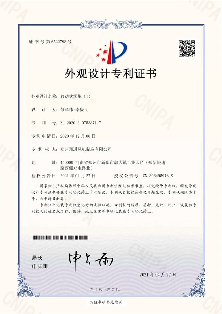 移動(dòng)式霧炮外觀設(shè)計(jì)專利證書(shū)